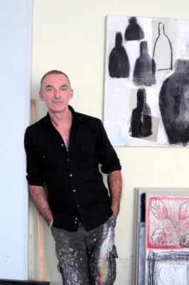 Evidente ? Rien n’est moins sûr. Et familière de moins en moins au fur et à mesure qu’ils se multiplient et profilèrent sur les quadrillages des toiles ou sur les petits formats carrés. Car leur familiarité est trompeuse. Ces pots contiennent bien des fleurs, c’est après tout leur fonction. Ils sont reconnaissables dans leur forme simple à peine ombrée d’un relief suggéré. Mais leur matière est ailleurs, parfois saturée de pigments, des rouges sombres, des bleus vifs, des tons de terre brûlée, définitivement contourés de noir mat. Et quand parfois ces contours se détachent sur des fragments de papier journal, alors l’objet quotidien se découpe sur un quotidien sans objet.